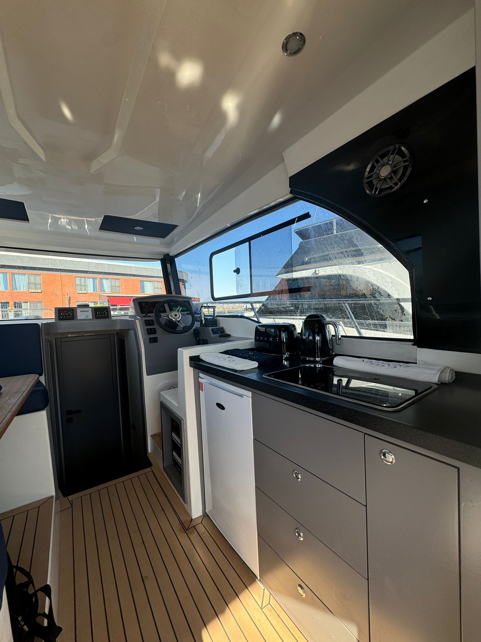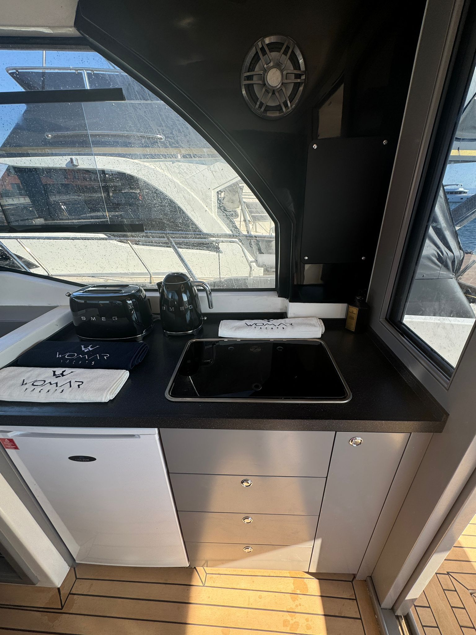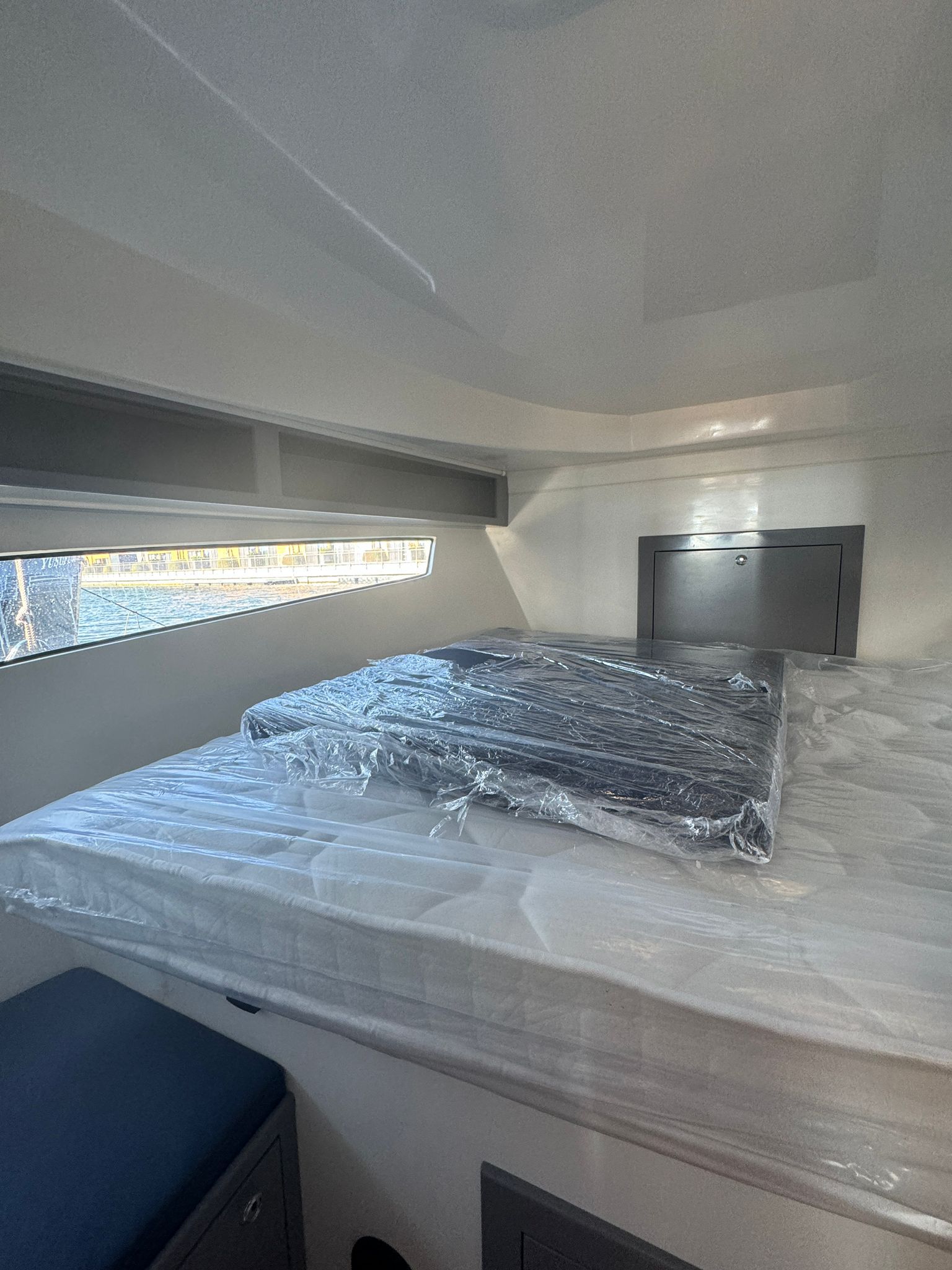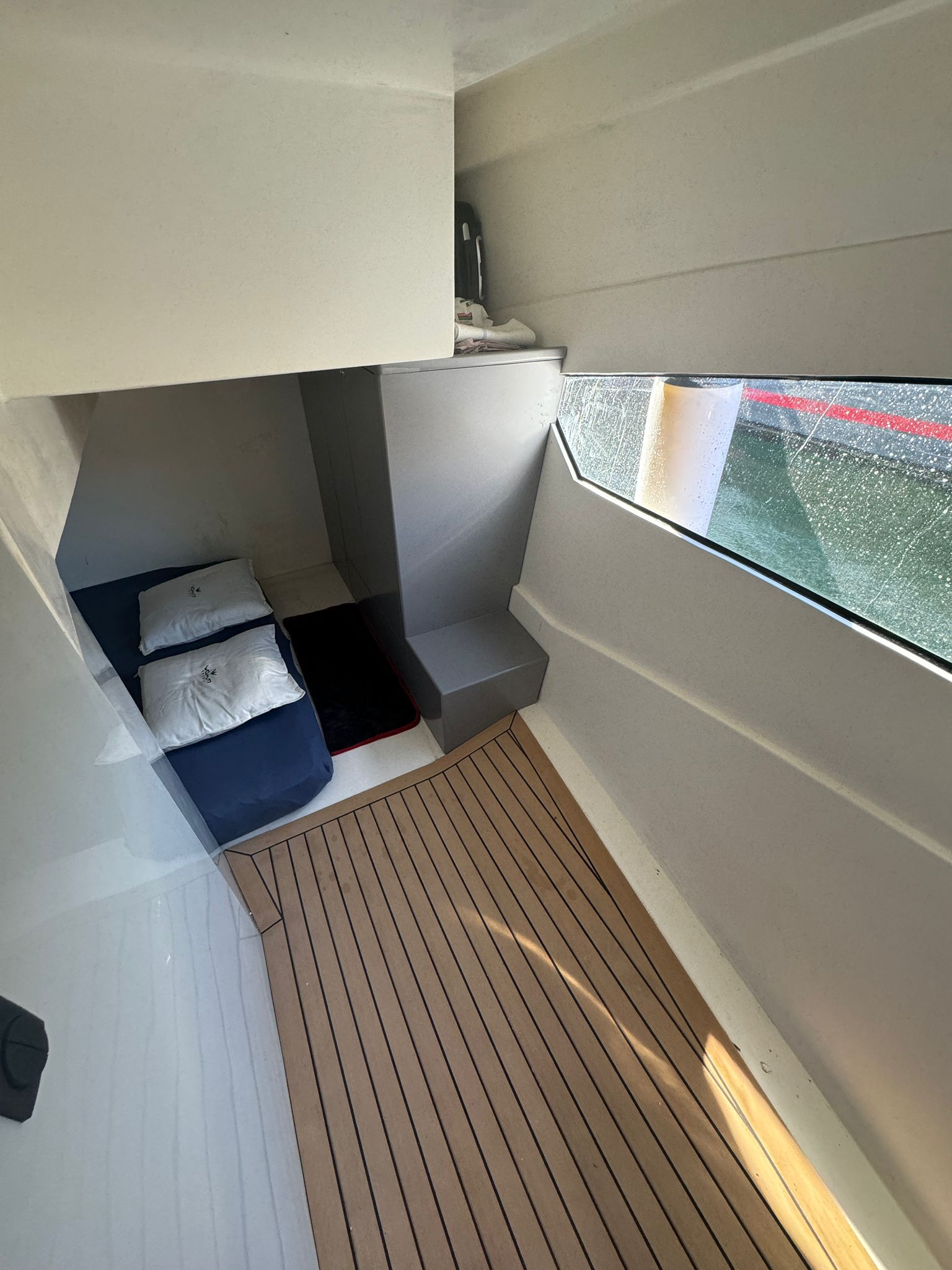 GALLEY EQUIPMENT Countertop & Sink Punto Mixer Tap Drawer Slides Single-Burner Built-in Stove 90 L, 220 V Refrigerator (1 Unit) MASTER CABIN EQUIPMENT Opening Portholes (20 x 40 cm, Aluminum) Opening Hatch (50 x 50 cm, Aluminum) Double Bed Wardrobes Ambient LED Lightin